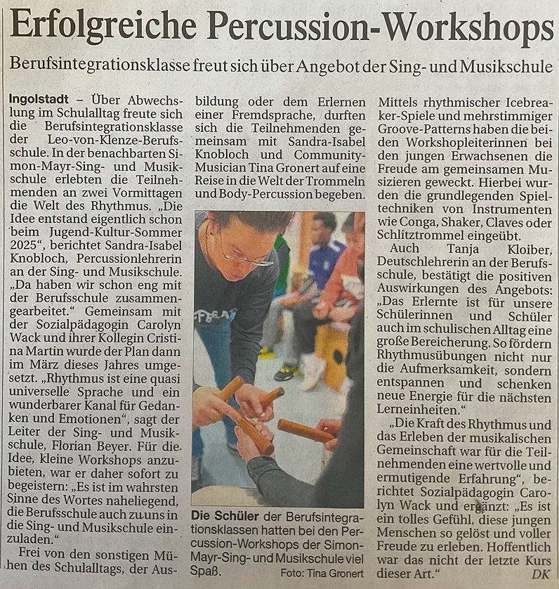 Bereits 2004 habe ich erfolgreich meine Ausbildung zur staatlich geprüften Leiterin der Popularmusik/Percussion mit pädagogischer Zusatzqualifikation an der Berufsfachschule für Pop/Rock/Jazz in Regensburg abgeschlossen. Seither widme ich mich voller Leidenschaft den verschiedensten Schlag- und Klanginstrumenten – von der Conga bis zum Cajon, von der Rahmentrommel bis zur Small Percussion.
